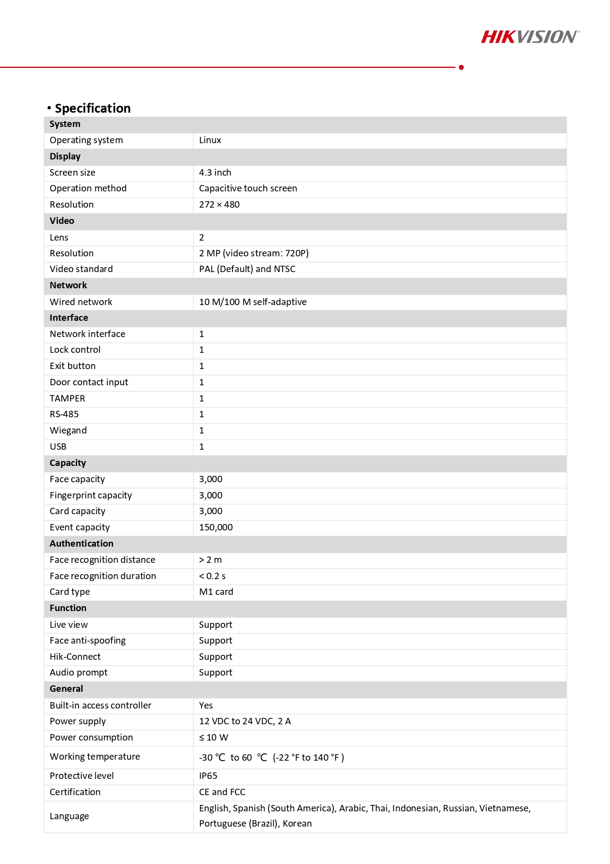 CONTROL D'ACCES FACIAL HIKVISION T341