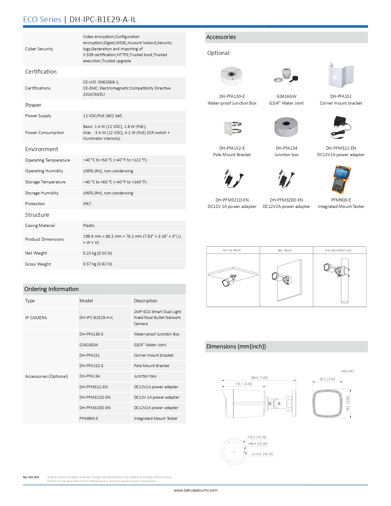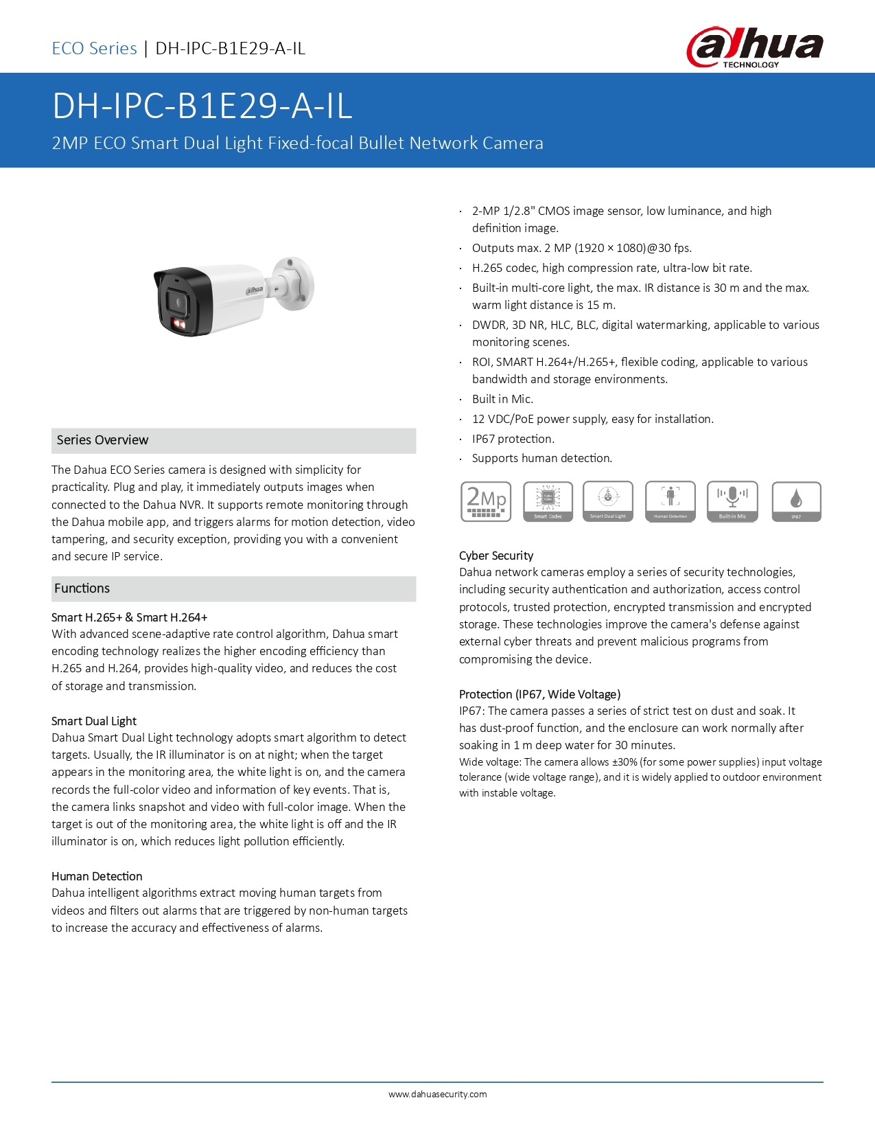 PoE/12V, compression H.265+, et conçue pour l’extérieur avec protection