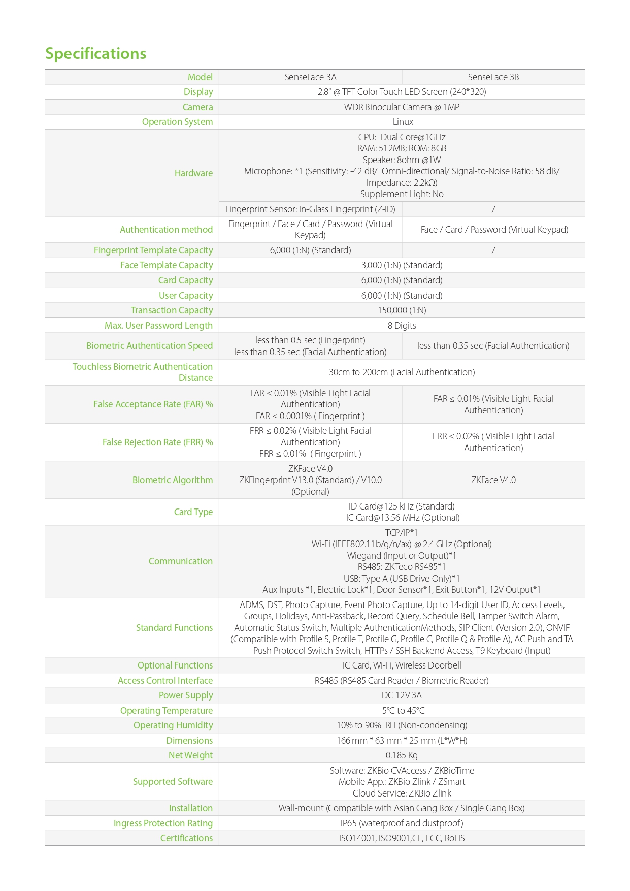 grande capacité d’identification (jusqu’à 3 000 visages, 6 000 empreintes et 6 000 cartes) avec