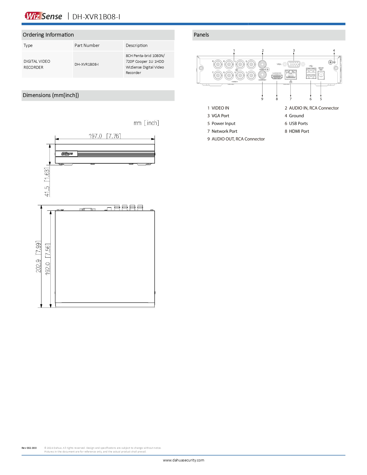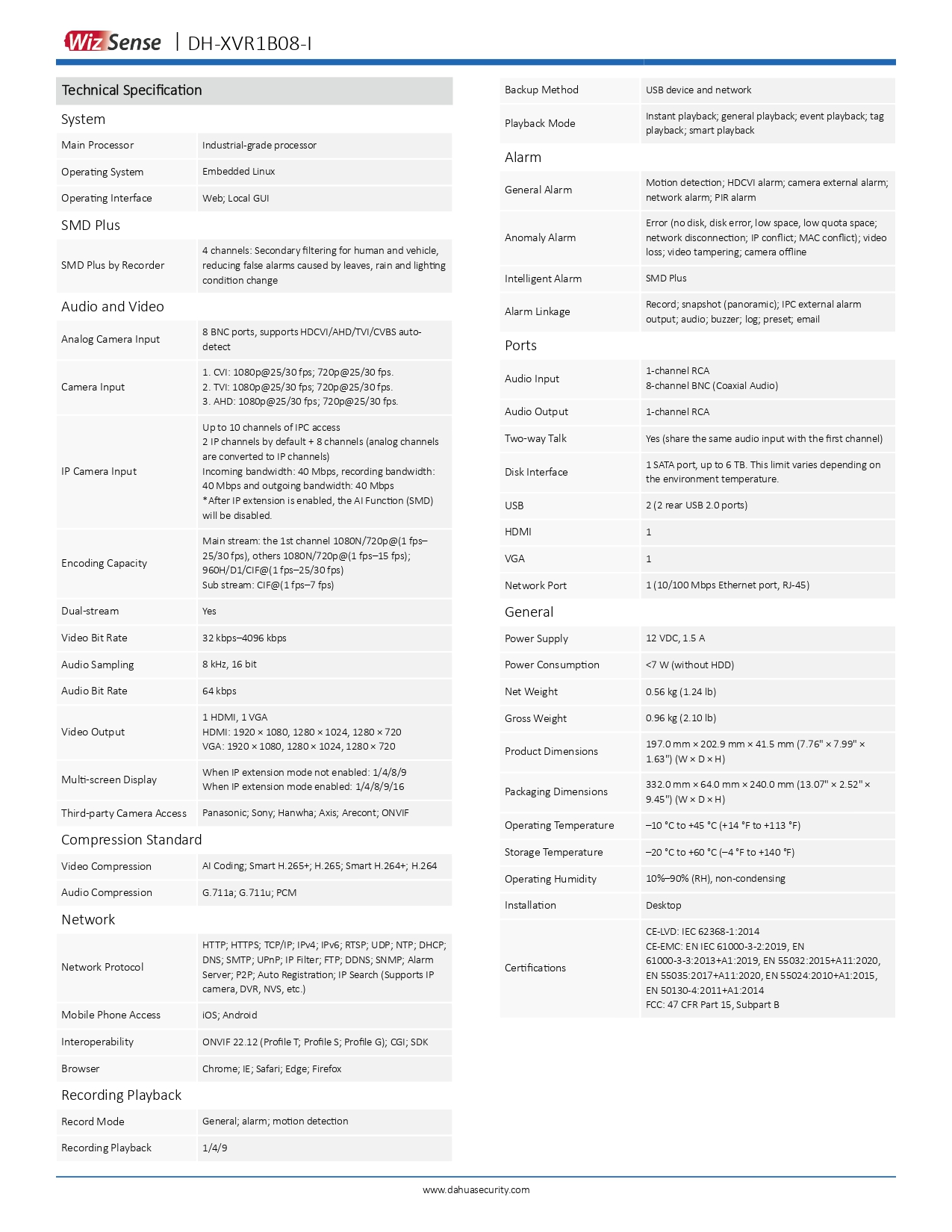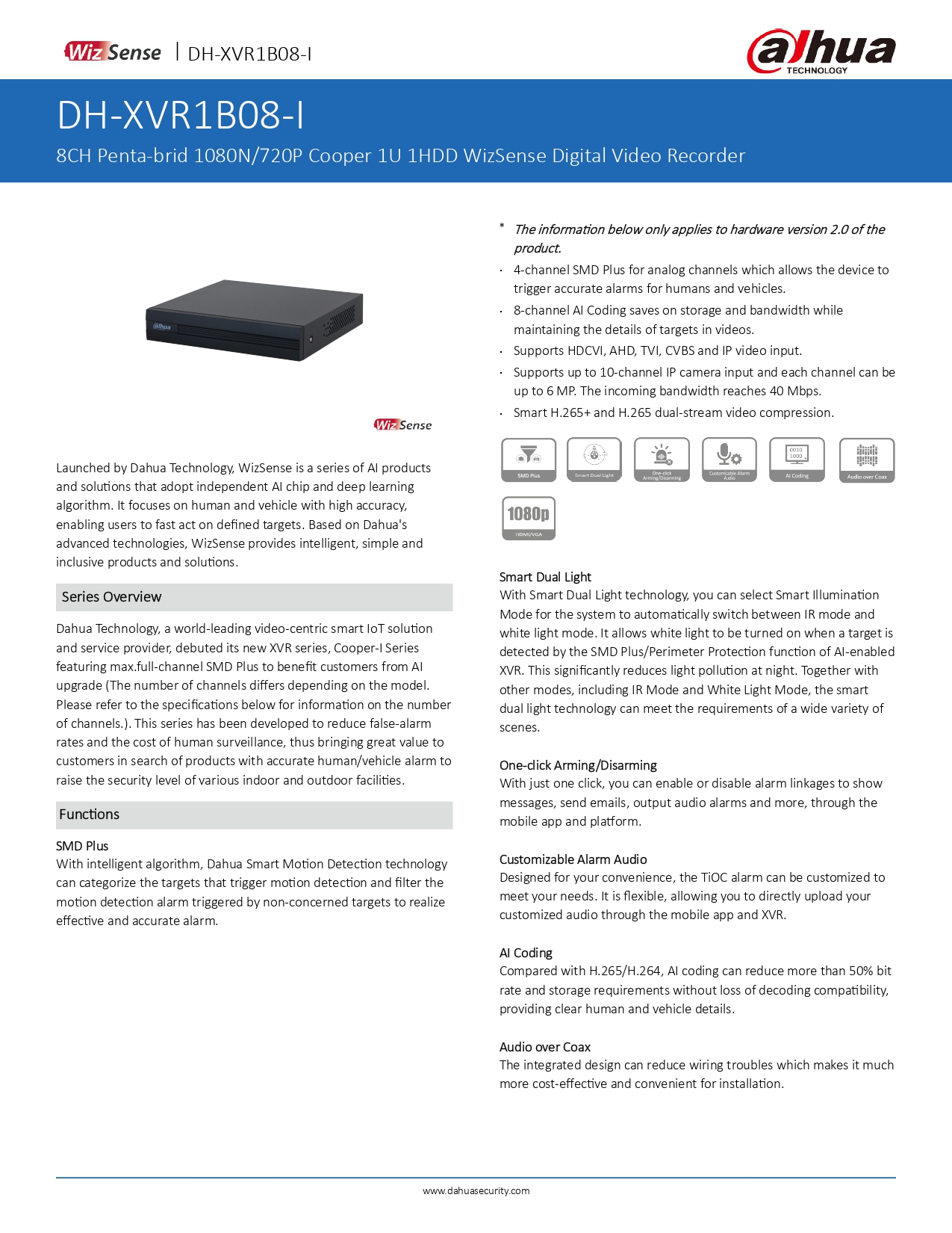 DVR Dahua XVR1B08-I est un enregistreur 8 canaux avec compression vidéo Smart H.265+ et H.265. Il supporte jusqu'à 10 caméras IP jusqu'à 6 MP et 8 entrées vidéo HDCVI, AHD, TVI, CVBS, offrant un débit entrant de 40 Mbps. Il utilise la détection SMD Plus pour des alertes précises et l'AI Coding pour optimiser le stockage.
